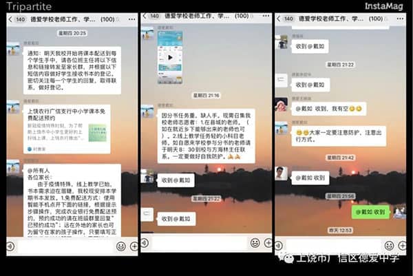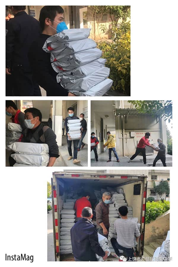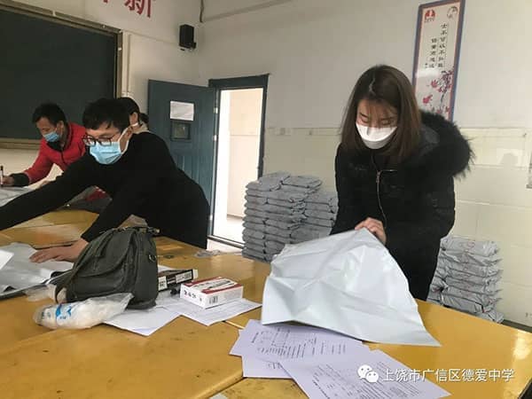 2020年春季开学,恰逢新冠病毒疫情,德爱学校的学子们在家井然有序地学习着,争取不落下的任何一门课程。学生线上直播课堂上课,教师线上备课,及时给予适当的指导。2月20日晚,为更好地让同学们在“停课不停学”中继续发力,德爱学校连夜部署2020年春季学期教学用书发放工作。党员教师志愿者一呼既出,其他教师志愿者也积极响应,承担起分拣、打包、装车等任务,而班主任们则负责统计学生的收件信息。