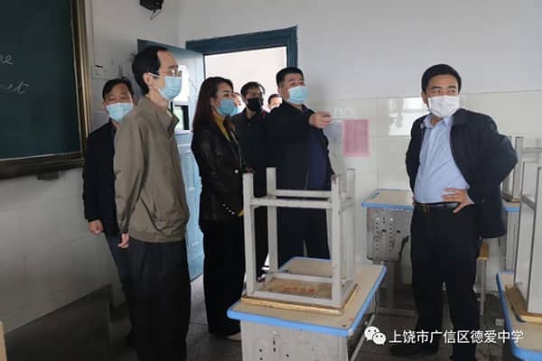 在查看了教室里的单人单桌单排的座位安排后,熊书记给予了高度的肯定,并强调学生在教室里上课要保证足够的间距和过道的通畅,课间学生出入方便,还要引导学生戴口罩上学。