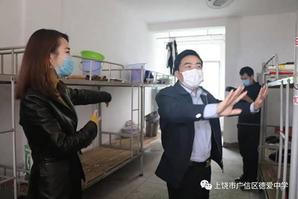 当然,寄宿学校学生相对集中,我校近日将在两栋宿舍楼的进出门处安装自动测量体温器,熊书记表示肯定,并要求尽快落实到位。在查看宿舍安排后特别强调,在住宿管理上,寄宿学生必须一人一床,做到每间宿舍人数较平时减半安排。学生宿舍实行封闭管理,进出必须实名验证,学生睡姿不得头朝头,要脚对脚,宿舍之间不允许串门,避免交叉感染,严禁学生在校外自行租房。