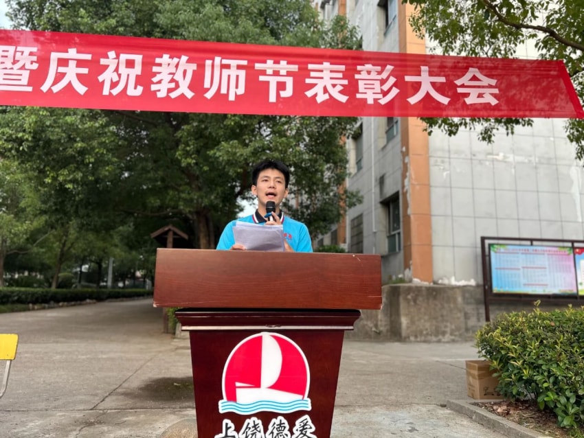 教师,把自己的青春和梦想都献给了孩子。一支粉笔,两袖清风,三尺讲台,四季晴雨,用语言播种,用彩笔耕耘,用汗水浇灌,用心血滋润。戴校长首先对向默默奉献在各个岗位上的全校教职员工以及大力支持学校工作的教师家属们致以最诚挚的节日问候和最崇高的敬意!接着她总结了过去的一学年我校在各方面取得的成绩,用实际行动诠释了“厚德载物,博爱求真”的校训精神。在教学科研上,我们取得了显著的成绩,师生们在各类竞赛中展获佳绩,彰显了学校的办学实力和师生的卓越风采。在校园文化建设上,学校开展了多彩的课外活动,十佳歌手大赛、辩论赛、朗诵比赛、合唱比赛、元旦晚会等等,丰富了课余生活,促进了同学们德智体美劳全面发展。特别是今年学考,我校总平均分747.4分,其中九( 3)班郭语霏同学总分819分,表现优异。这些成绩的取得,凝聚了全校师生的智慧和汗水,也离不开社会各界的大力支持和帮助。戴校长还提出了几点期望和要求:第一,志存高远,勇于追梦。乒乓魔王孙颖莎说“梦想不会发光,发光的是追梦的自己”。希望同学们能够树立远大的理想,勇于追求自己的梦想。无论遇到多少困难和挑战,都要保持坚韧不拔的意志和勇往直前的精神,用实际行动书写属于自己的辉煌篇章。 第二,勤奋学习,全面发展。希望同学们能够珍惜时光,勤奋学习科学文化知识,同时注重培养自己的创新精神和实践能力,积极参加体育锻炼,增强身体素质;参与社会实践,拓宽视野;提升艺术修养,陶冶情操,努力成为一个全面发展,有社会责任感的人。第三, 尊师重教,团结友爱。老师是我们成长道路上的引路人。希望大家能够尊敬老师、听从教诲、虚心求教。同时,也要珍惜同学之间的友谊,相互学习、相互帮助、共同进步,在团结友爱的氛围中共同成长、共同进步。第四,家校共育,携手同行。希望每一位老师都能与家长保持密切联系,让家长也能时刻参与孩子的教育过程,共同关注孩子的成长与发展,做好家校携手合作,为孩子营造一个良好的成长环境。