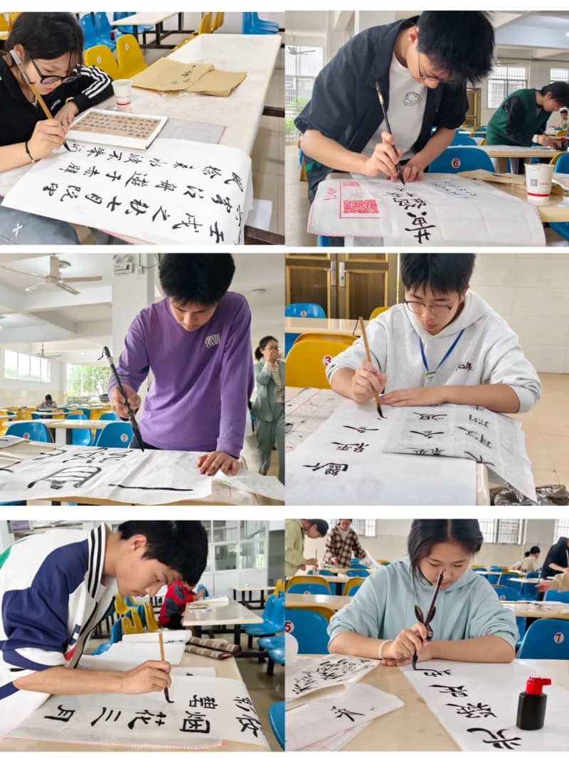 篆隶楷行各展风采,比赛现场气氛热烈而专注,同学们屏气凝神、精心构思,一幅幅作品在笔尖流淌成型。