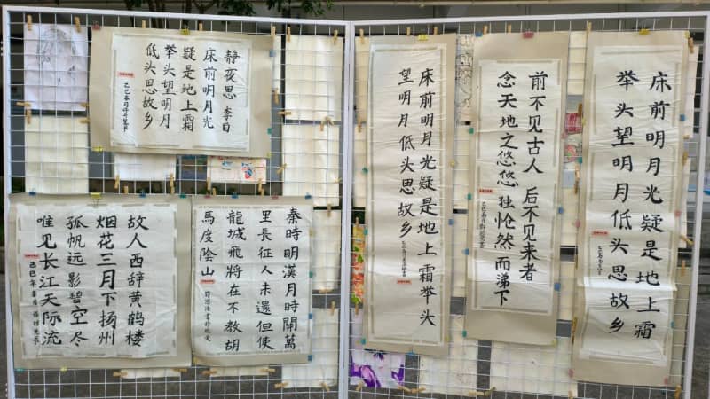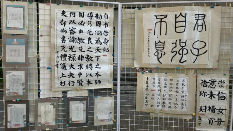6月16日,书画成果展在学校内院中举行。作品风格多样,意趣盎然,引得师生驻足品评。