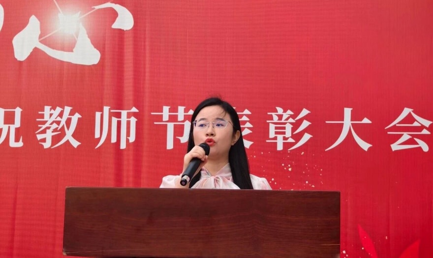 新教师代表崔韵老师作为德爱学校的毕业生,怀着感恩与荣幸之情发言。她回顾了2007-2010年在母校的求学时光,感谢当年恩师们的教诲与指引。如今以教师身份重返校园,她深刻理解了教师的责任与意义。她代表全体新教师向前辈致敬,向同学们寄语珍惜时光、理解师恩,并郑重承诺将以优秀前辈为榜样,恪守师德、关爱学生,传承德爱精神,不负学校、家长与学生的期望。最后,她祝愿全体教师节日快乐,母校未来辉煌。