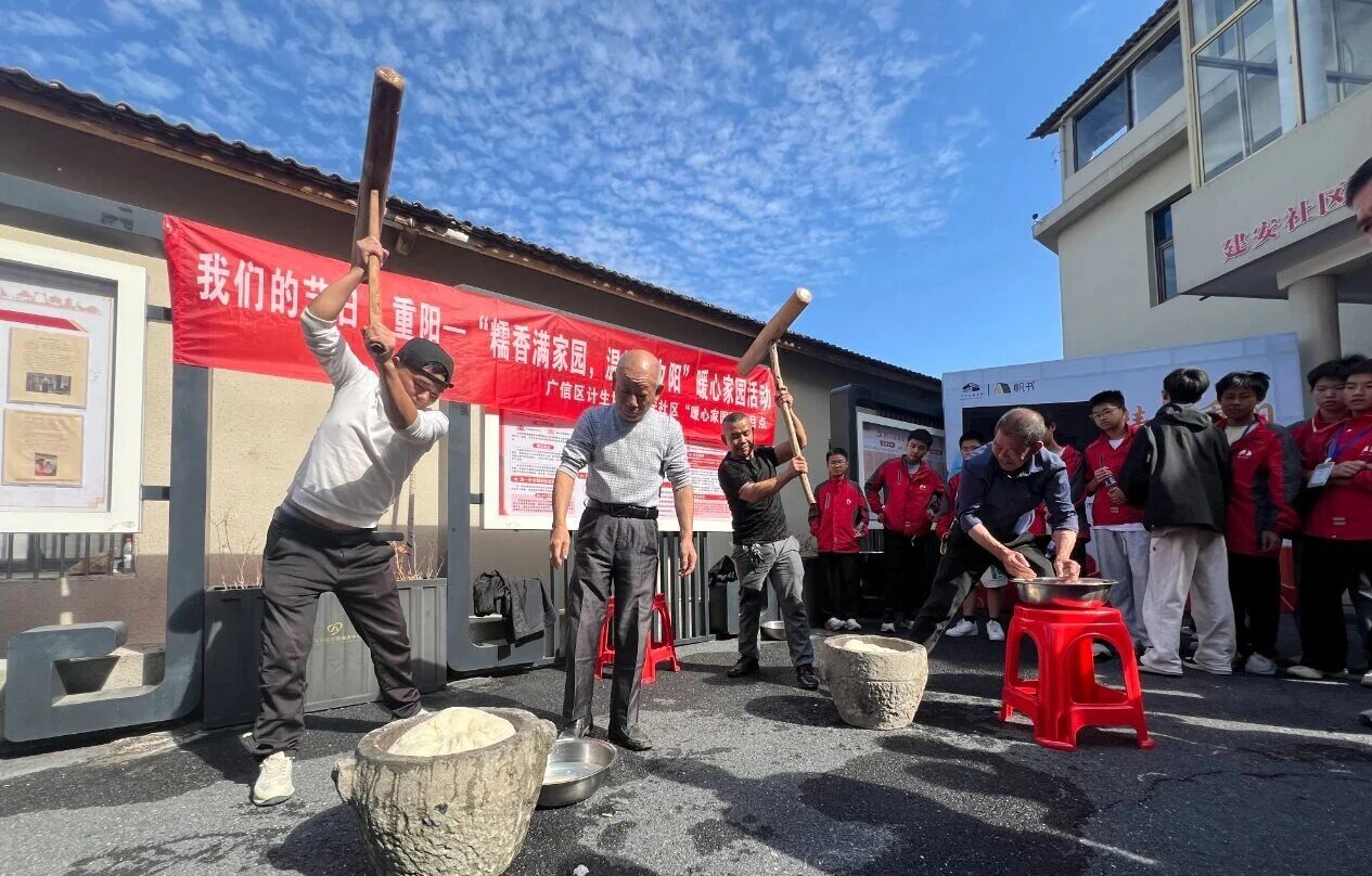 13:30,学子们准时抵达,刚进门就被老人们的慈祥笑容感染,纷纷上前拉着老人唠家常,关切询问生活起居。不远处,打糍粑的热闹场景正在上演,木槌与石臼碰撞出“咚咚”声响,老人们一边观看传统技艺,一边讲述民俗趣事。