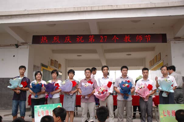主席台前举行了颁奖和学生献花仪式,受到表彰的有郑锐、严旭雯、方燕、吴梅桂、张运罡、徐安邦、方海林、赖发祥、程国移、汪兵发十位教师。