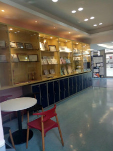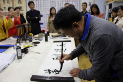 从习字室到图书馆、教室、实验室、食堂,最后我们来到了会议室。值得一提的是,在习字室有一部分教室很幸运的得到了刘功海老先生的墨宝,戴方校长得到一幅《临江仙●滚滚长江东逝水》。程国移主任和叶宜火老师都当场展示了自己的书法作品。
