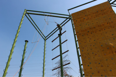 第二项,挑战高空,这是项心理素质的游戏,每队都需要有四位老师爬上八米高的钢柱,在大约1.5平方分米的小平台上站立起来,然后跳跃出去,抓住在一米开外的棍子,每一位成功跳出平台的老师都引起了其他同事的喝彩与呐喊,那种兴奋那种激情也渲染着周围每一个人。虽然这个项目规定只需要有四位老师完成,而且教练也一再强调有身体不适的老师不需要参加,但是几乎每一个老师都勇敢的攀登上去了。此刻真心为所有人鼓掌。
