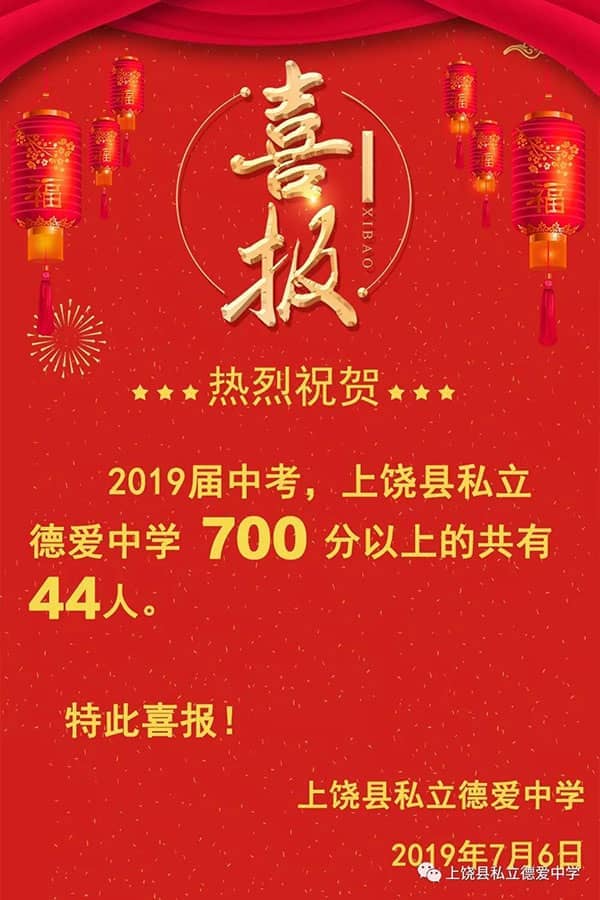 2019届中考,上饶县私立德爱中学700分以上的共有44人(全县700分以上共88人)。德爱学子,用优异的成绩展现了“敦品笃行,励学日新”的德爱风采!