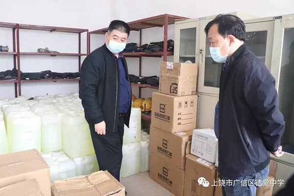 在校园临时隔离处,熊孙魁书记详细询问了这里的情况,对我校的消毒液、洗手液、体温枪、口罩等物资储备表示肯定。他指出,这些防疫物资宁可备而无用,不可用而无备,要时刻关注有发热、咳嗽等症状的学生。