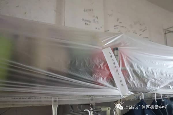 经过体温测量无异常者即可带上行李来到主教学楼的消毒通道,这里有两台自动喷雾的消毒器,他们能对物件进行消毒。这样完成之后就可以去宿舍了。如遇单次不能完成行李搬运的,工作人员会将备用标签贴上姓名后放置内院行李框里待二次搬运。