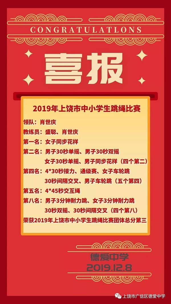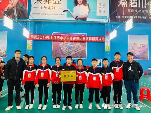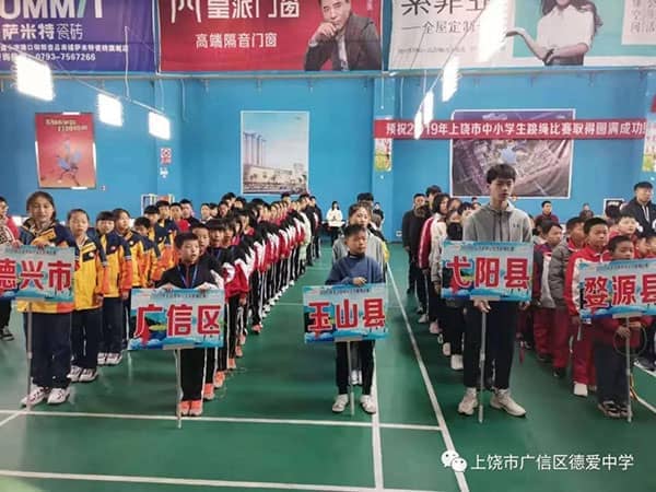 上饶市中小学生跳绳比赛于12月7日至8日在德兴市全民健身馆举行。本次比赛由上饶市教育体育局承办,来自上饶市各中小学的29支队伍参加,德爱中学跳绳队不仅代表学校,更是代表广信区参加了本次比赛。