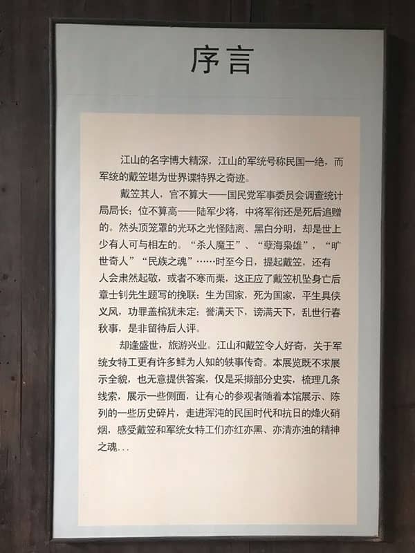来到戴笠的女特务培训基地,站在里边,读着这些介绍后,脑子里都是影视剧场景,有一种说不出的恐惧,丝丝喘不上气儿。虽说无论是才艺还是智慧以及胆识与心理,女特工们的确让人敬佩,但真难以想象那些女特务过着怎样的生活,如何为国献身。