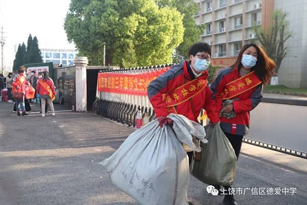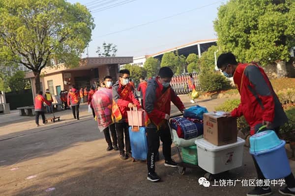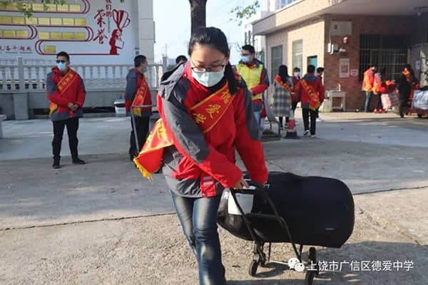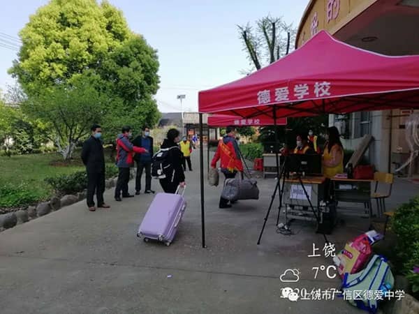 此时的校门口与以往有很大不同。7:10开始,校长、老师、校医、保安便全部到岗,严阵以待,各司其职。除了初三所有老师,其他年级的50名志愿者教师也佩戴起了“德爱学校欢迎您”的绶带,井然有序地帮学子们搬运大件行李物品。
