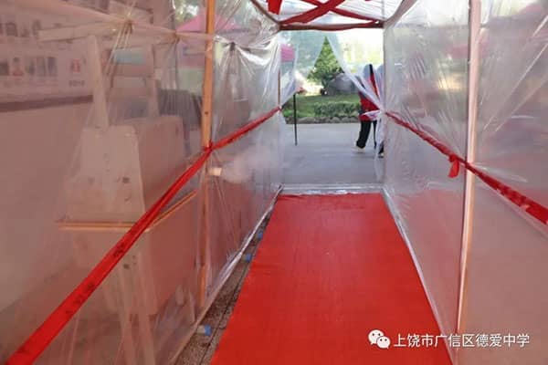大厅的消毒通道配备了两台自动蒸汽消毒器,大件行李物品经过这个消毒通道就可以进入校园了。