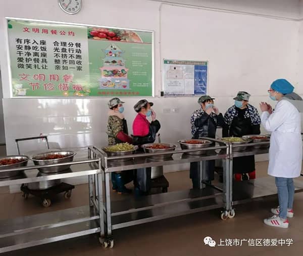 中午11:30第一批学生井然有序地进入食堂,先后找到自己的座位,同向单人单座。15分钟后,第二批学生用餐。较以往的分桌分食式不同,学生均自备碗勺,排队打饭菜,确保饮食餐具的卫生。虽说只有15分钟,但没有出现半点拥挤现象,所有同学都在预计时间内有序完成。经开区医院驻德爱学校疫情防控医务员详细地给打菜阿姨讲解如何正确佩戴口罩及手套,保证饮食安全。
