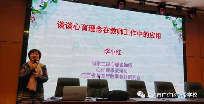 为提高教师在学生心理健康教育方面的素质与能力,2020年12月9日下午,我校特邀江西省教研室心理教研员李小红老师走进校园,为全体教师做了一场主题为“谈谈心育理念在教师工作中的应用”的讲座。 讲座的主要内容包括“了解儿童的心理发展特点”“学习心理健康教育的知识”“心育理念在教师工作中的应用”三大方面。