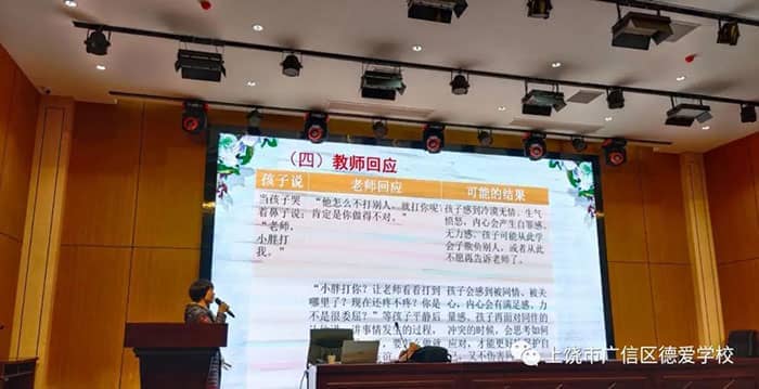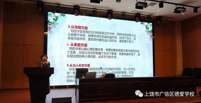 在“心育理念在教师工作中的应用”这个版块,李老师列举了很多具体案例,分析在教学中要从成绩、表现、性格、家庭、为人处世等方面甄别学生是否有心理问题,并提出尊重学生和家长、换位思考、理解学生、调整认识、促进个性形成等有效做法。