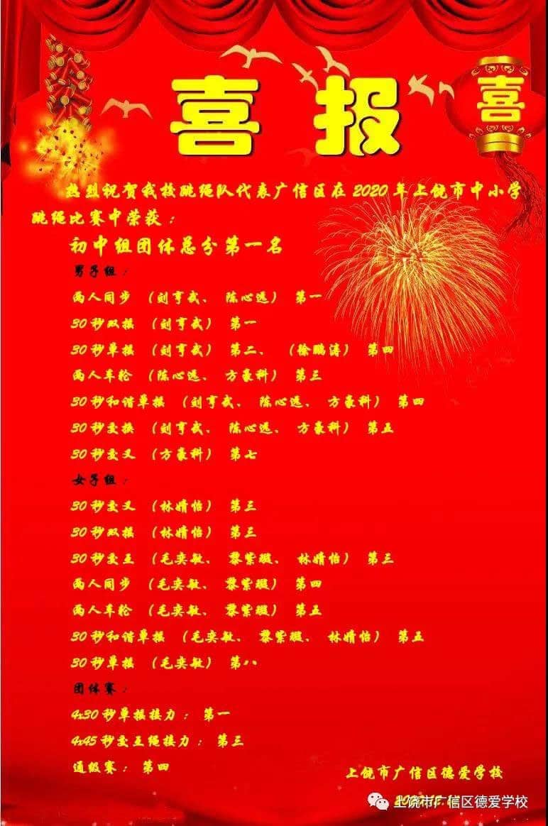 喜报——祝贺我校在2020年上饶市中小学生跳绳比赛中荣获初中组团体总分第一名