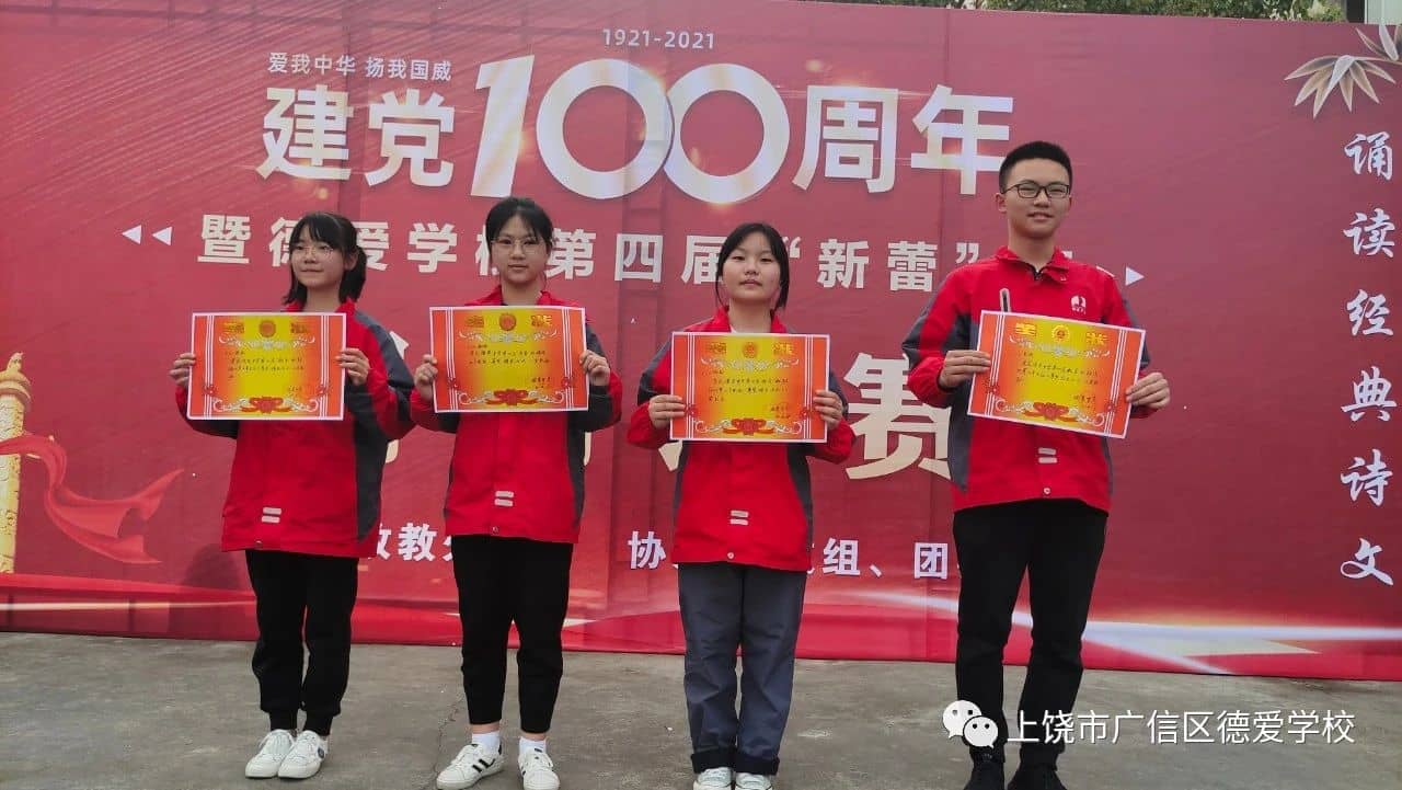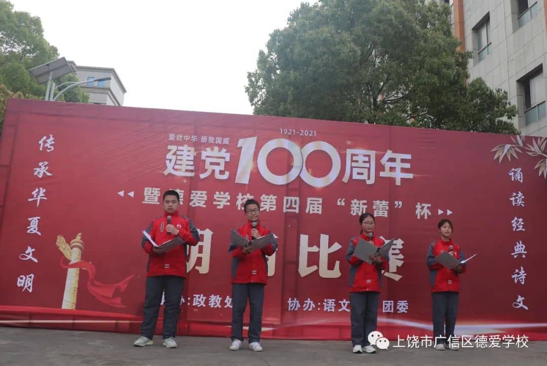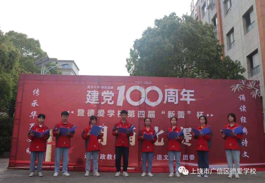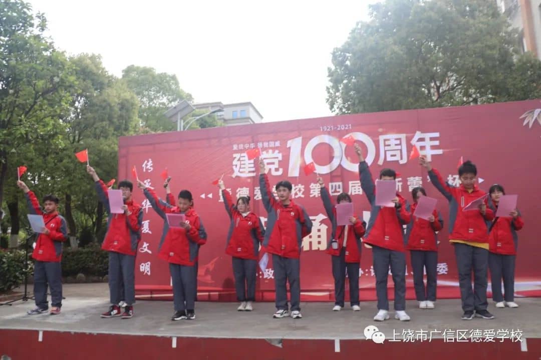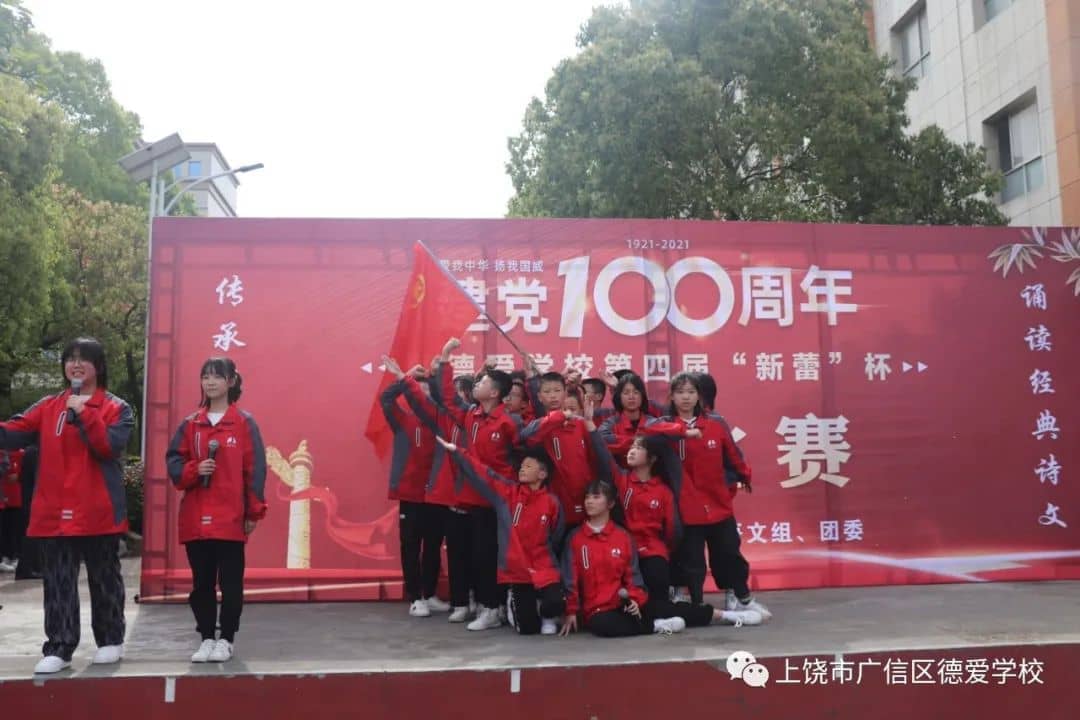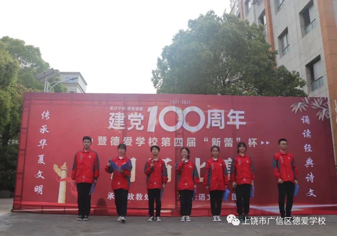 同学们都在诗文朗诵中展现着自己丰富又充沛的情感:有的回顾了我党百年来的艰辛历程,有的讲述着我党艰苦抗战的故事,有的讴歌了我党带领人民走上复兴之路的壮举......或高昂,或悲壮,或柔缓,无一不表现德爱学子对我党的无比崇敬与热爱。比赛在八(10)班代表队带领全体师生高呼“没有中国共产党就没有新中国”声中圆满结束。