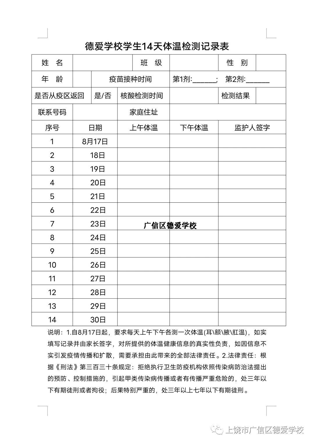 2. 坚持自主开展健康监测,学生在家自测体温,并如实登记体温(表格见附件),学生返校带回。