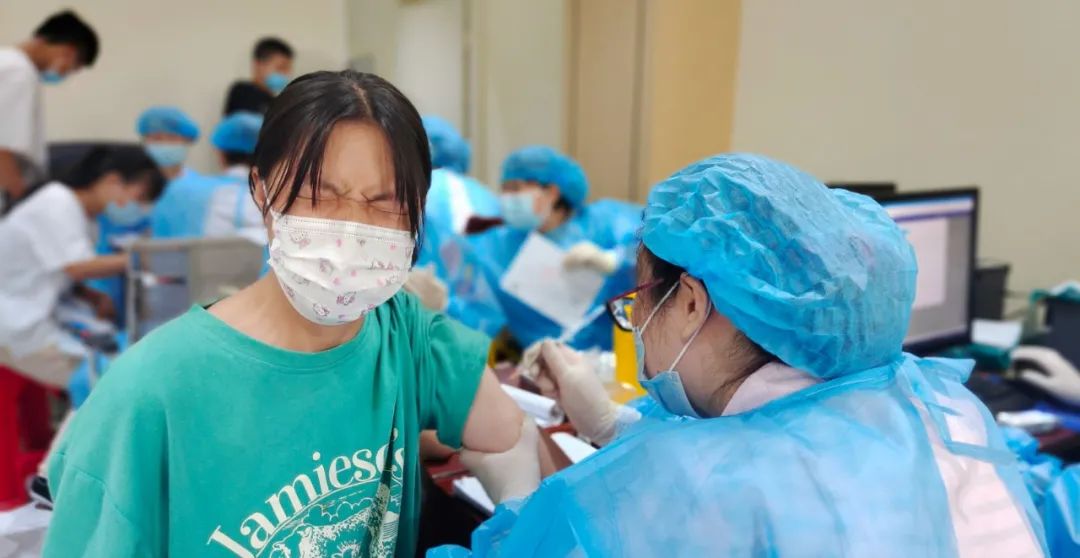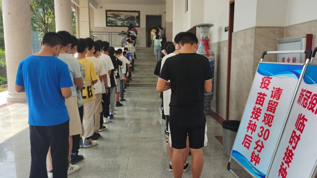 接种时所有学生以班级为单位,严格落实戴口罩、不聚集、“一米线”等防疫措施,在老师的指引下分批次排队进入对应区域,通过预检、登记、接种、留观等程序完成新冠疫苗接种。