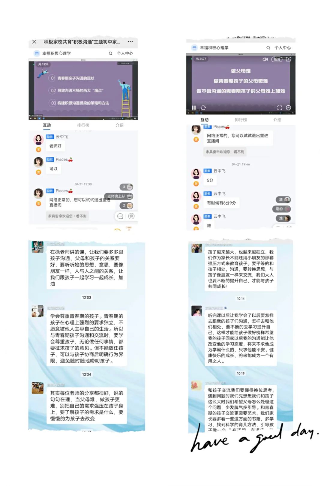 望子成龙、望女成凤是每个家长对孩子的殷切期望。每一次的讲座家长们都认真聆听,班主任也安排大家分享“育儿育女心经”,分享观看讲座后的体会和感悟。目前此项活动参与率达95%以上,家长书面反馈率已达60%。家长们也纷纷表示学校的这项活动意义深远,给他们在今后的育儿道路上指明了方向。
