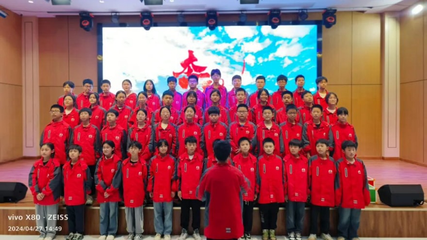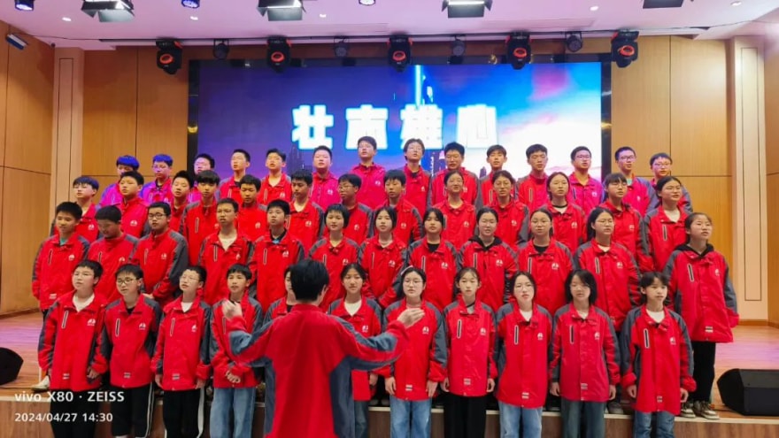 比赛中,八(1)班同学将架子鼓表演、朗诵、手势表演与大合唱融为一体,独树一帜,圈粉无数。八(4)班将一颗颗闪亮的星星照耀舞台上的每一处角落,诠释了什么叫真心英雄。本次比赛,全体师生精心编排,形式多样,以动人的声音,炽热的情感歌颂生活和学习。