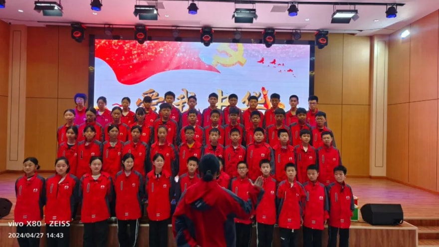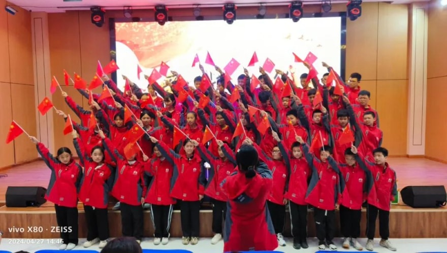 六(4)班同学为大家带来的《闪闪的红星》揭开了比赛的序幕,同学们伴着优美的旋律倾情献唱,赢得台下阵阵喝彩;《奔跑》、《壮志雄心》、《保卫黄河》、《爱我中华》、《没有什么不同》、《真心英雄》、《雪龙吟》、《你从未离去》、《明天会更好》、《少年中国说》、《逆战》、《一二三四歌》、《走向复兴》、《打靶归来》、《歌唱祖国》歌声高昂,气势磅礴,展现了同学们自强不息、昂扬奋进的精神面貌,唱出了广大学子对祖国浓浓的爱,同学们在歌声中感悟小我与大我的真谛。