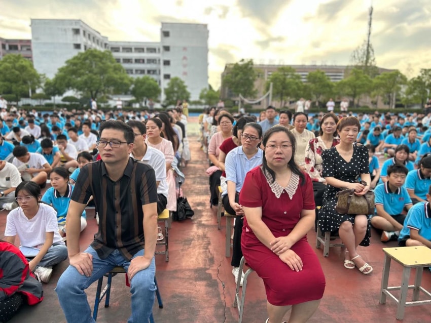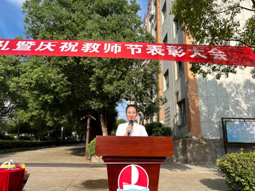 教师,把自己的青春和梦想都献给了孩子。一支粉笔,两袖清风,三尺讲台,四季晴雨,用语言播种,用彩笔耕耘,用汗水浇灌,用心血滋润。戴校长首先对向默默奉献在各个岗位上的全校教职员工以及大力支持学校工作的教师家属们致以最诚挚的节日问候和最崇高的敬意!接着她总结了过去的一学年我校在各方面取得的成绩,用实际行动诠释了“厚德载物,博爱求真”的校训精神。在教学科研上,我们取得了显著的成绩,师生们在各类竞赛中展获佳绩,彰显了学校的办学实力和师生的卓越风采。在校园文化建设上,学校开展了多彩的课外活动,十佳歌手大赛、辩论赛、朗诵比赛、合唱比赛、元旦晚会等等,丰富了课余生活,促进了同学们德智体美劳全面发展。特别是今年学考,我校总平均分747.4分,其中九( 3)班郭语霏同学总分819分,表现优异。这些成绩的取得,凝聚了全校师生的智慧和汗水,也离不开社会各界的大力支持和帮助。戴校长还提出了几点期望和要求:第一,志存高远,勇于追梦。乒乓魔王孙颖莎说“梦想不会发光,发光的是追梦的自己”。希望同学们能够树立远大的理想,勇于追求自己的梦想。无论遇到多少困难和挑战,都要保持坚韧不拔的意志和勇往直前的精神,用实际行动书写属于自己的辉煌篇章。 第二,勤奋学习,全面发展。希望同学们能够珍惜时光,勤奋学习科学文化知识,同时注重培养自己的创新精神和实践能力,积极参加体育锻炼,增强身体素质;参与社会实践,拓宽视野;提升艺术修养,陶冶情操,努力成为一个全面发展,有社会责任感的人。第三, 尊师重教,团结友爱。老师是我们成长道路上的引路人。希望大家能够尊敬老师、听从教诲、虚心求教。同时,也要珍惜同学之间的友谊,相互学习、相互帮助、共同进步,在团结友爱的氛围中共同成长、共同进步。第四,家校共育,携手同行。希望每一位老师都能与家长保持密切联系,让家长也能时刻参与孩子的教育过程,共同关注孩子的成长与发展,做好家校携手合作,为孩子营造一个良好的成长环境。