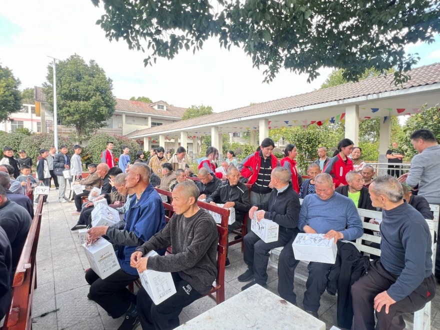 学生志愿者给每一位老年人都送上了牛奶,帮忙打扫老人的住处卫生,陪他们散步、聊天。