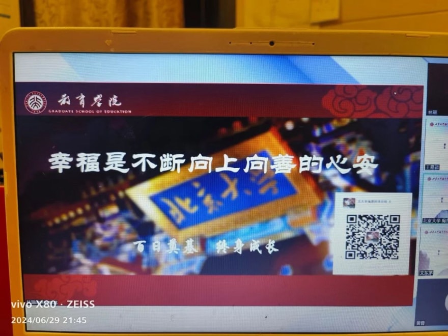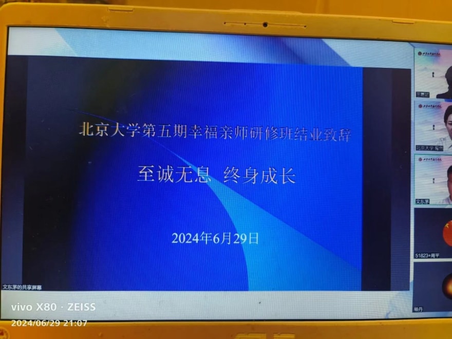 戴校长回顾了这一段研修历程,为参训老师感到自豪。她指出,幸福的教育是找到自身的使命和价值,是看到学生的点滴变化,是教学相长。她希望教师们能带上北大亲师的智慧,通过连贯一致、长期不断的“教、学、研、修”,更新对幸福的理解,提升幸福感,在未来教育之路上,努力做一名“幸福亲师”,将心安幸福融入到日常教学与家庭教育中,与孩子们共同成长,收获更加幸福的家庭关系、更积极的工作状态和更好的工作成效。