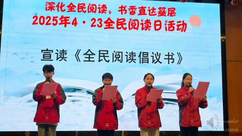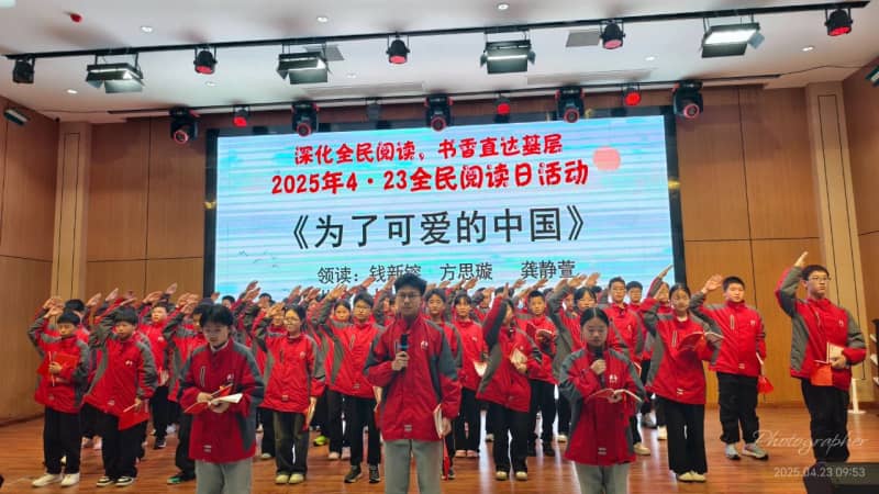 随后,由七(5)班郑宇露、七(12)班徐妙善、八(8)班吴宇、九(2)班邱郭豪四位同学领读《全民阅读倡议书》,向全社会发出“爱读书、读好书、善读书”的倡议。七(8)班全体同学齐诵了《为了可爱的中国》的经典选段,重温了方志敏同志坚贞不屈的革命故事,感受了方志敏铁骨铮铮的革命气节。希望我们能以方志敏之笔,绘就信仰底色;以今人之智,续写可爱的中国。