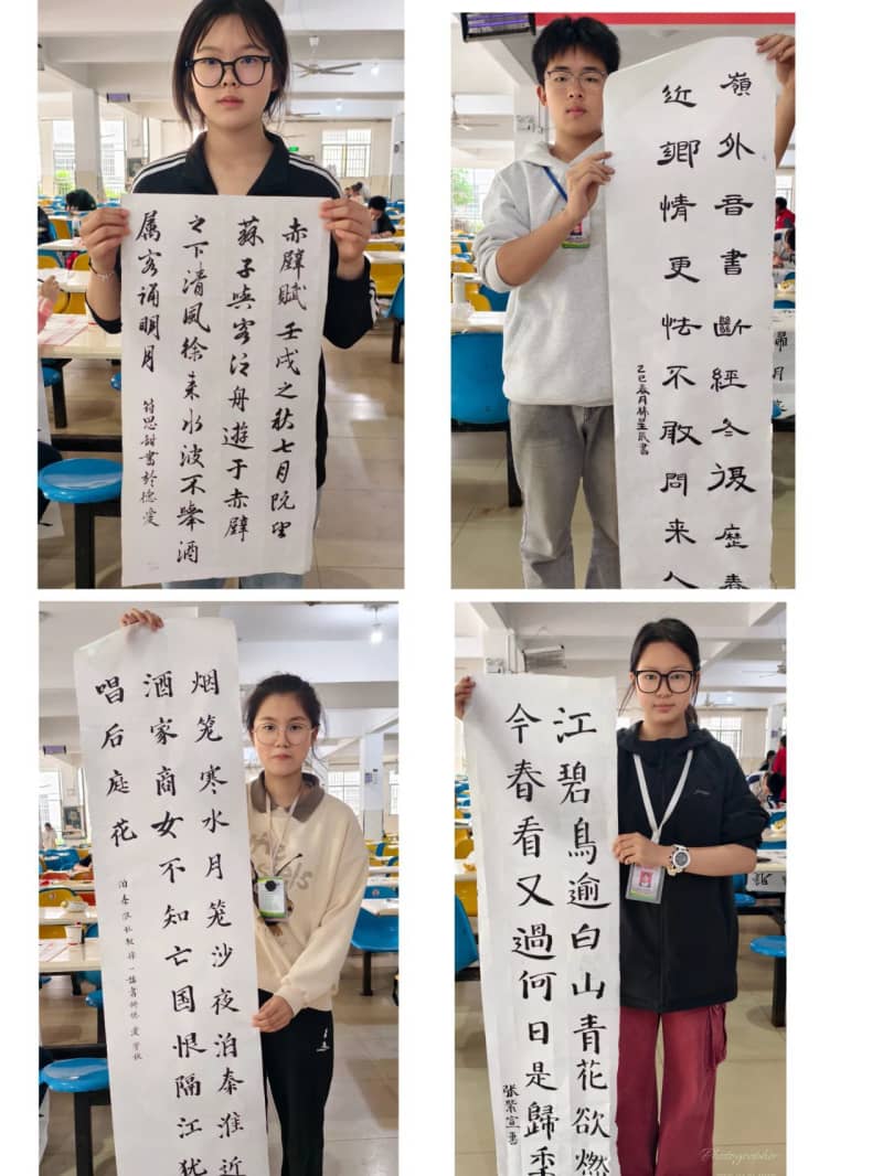 篆隶楷行各展风采,比赛现场气氛热烈而专注,同学们屏气凝神、精心构思,一幅幅作品在笔尖流淌成型。