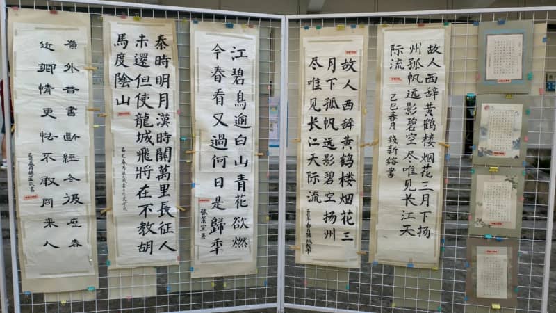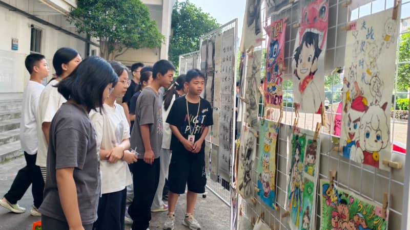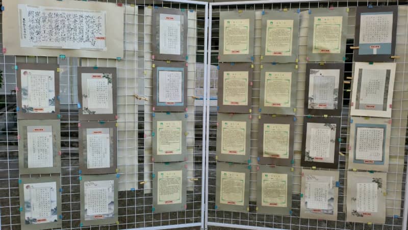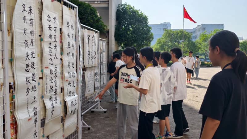 6月16日,书画成果展在学校内院中举行。作品风格多样,意趣盎然,引得师生驻足品评。