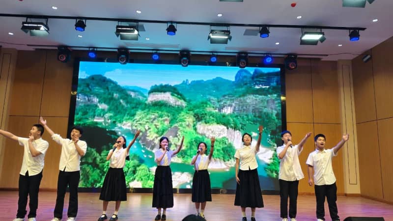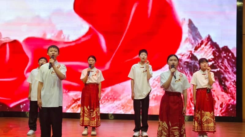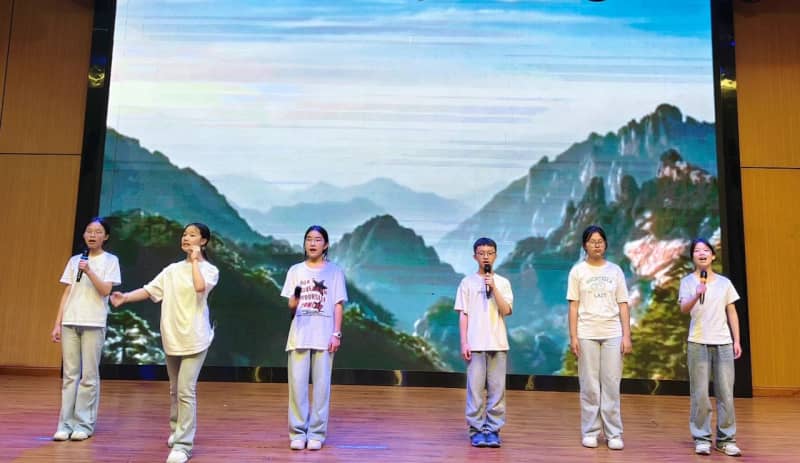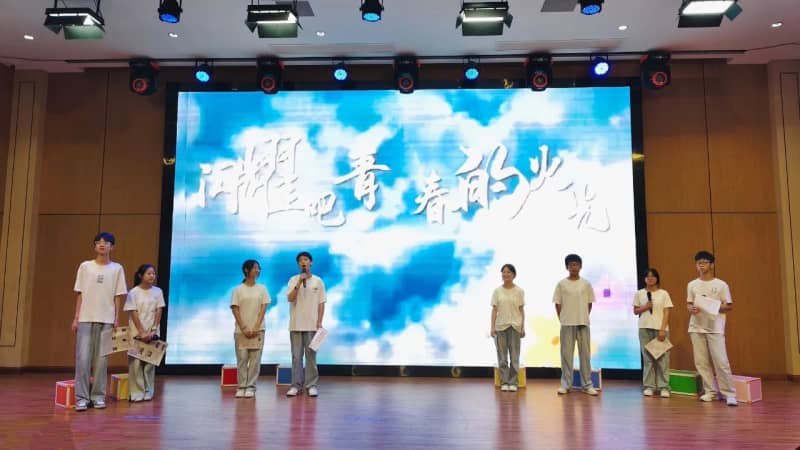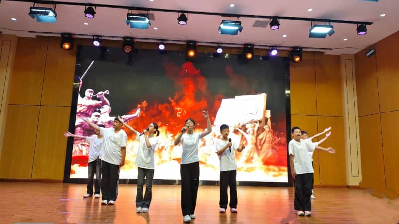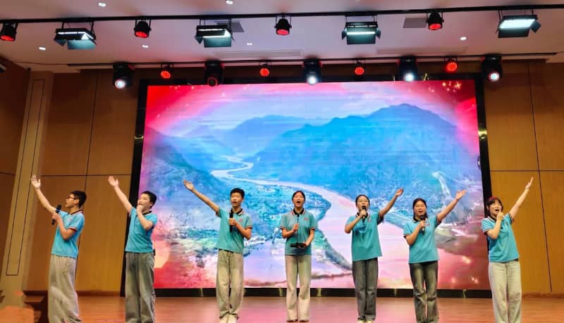 七(8)班方思璇等同学带来的《读中国》,饱含着对祖国炽热的爱,从对历史辉煌的自豪,到对沧桑岁月的感慨,再到如今昌盛中国的赞美,让观众的脑海里跟着展开了一幅波澜壮阔的历史画卷,引发了在场所有人强大的情感共鸣。八(2)班张麟夫等同学以磅礴之势朗诵了《百年沧桑》,带领大家共同走进一段段镌刻着岁月温度的故事,在光影流转间,触摸历史的厚重,感悟奋斗的力量,见证属于这篇土地的百年风华。他们分别为七年级场和八年级场点燃了最炽热的豪情,也为比赛画上了圆满的句号。