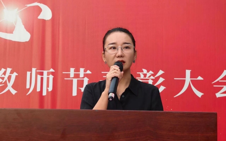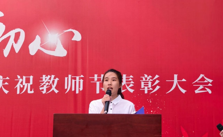 新教师代表崔韵老师作为德爱学校的毕业生,怀着感恩与荣幸之情发言。她回顾了2007-2010年在母校的求学时光,感谢当年恩师们的教诲与指引。如今以教师身份重返校园,她深刻理解了教师的责任与意义。她代表全体新教师向前辈致敬,向同学们寄语珍惜时光、理解师恩,并郑重承诺将以优秀前辈为榜样,恪守师德、关爱学生,传承德爱精神,不负学校、家长与学生的期望。最后,她祝愿全体教师节日快乐,母校未来辉煌。