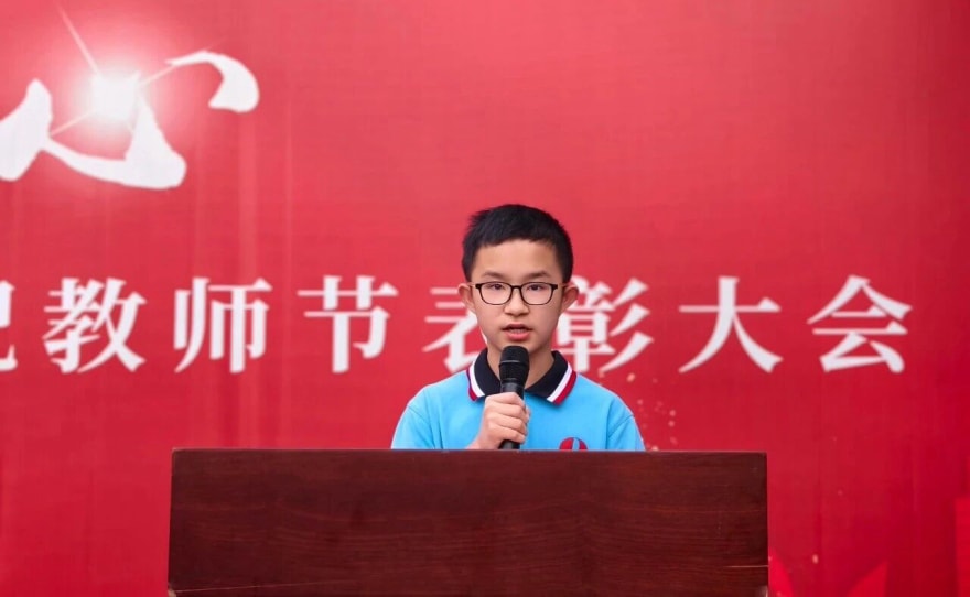 九(2)班张遴夫代表全校同学发言,首先向辛勤付出的老师们致以诚挚祝福。他回顾了自己从五年级踏入德爱学校,从最初不适到逐渐融入并深深喜爱的过程,还安慰刚入学的七年级学弟学妹,称德爱是幸运之地,拥有优美环境、和蔼领导、精湛老师与友善同学,为此感恩学校、校长及全体老师。随后,他分享四点学习体会:树立明确目标、专注课堂及时消化、勤于复习善用方法、整理错题举一反三。最后,他勉励同学们努力成长,为校争光,并向师生们送上美好祝愿。