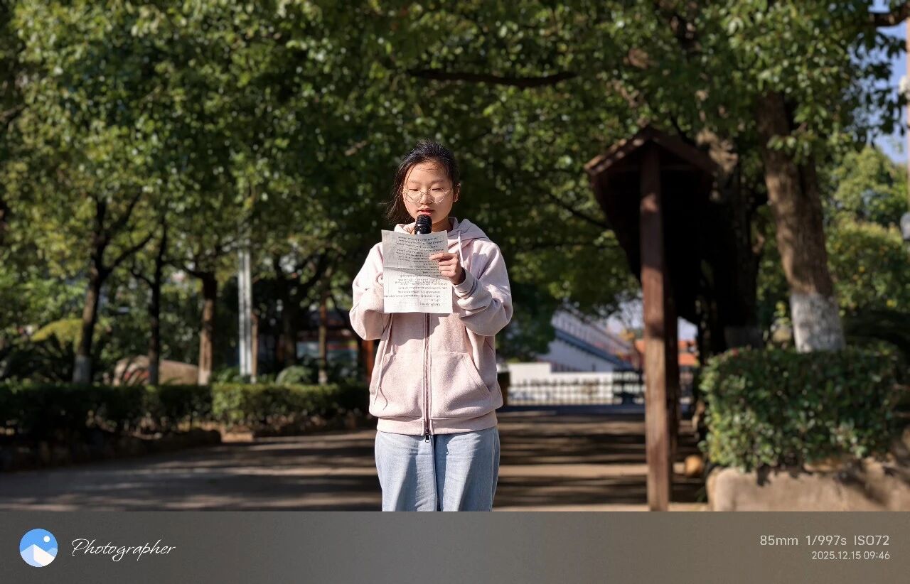 12月15日周一上午,全校师生齐聚操场,举行“铭记历史 珍爱和平”主题升旗仪式。伴随着雄壮的国歌,五星红旗冉冉升起,全体师生神情肃穆,向南京大屠杀死难同胞默哀一分钟。国旗下演讲环节,九(10)祝文静以“勿忘国殇 吾辈自强”为题,结合历史史实,讲述了那段山河破碎、同胞受难的悲壮岁月,号召同学们铭记历史教训,以青春的誓言,表达了新时代少年传承先烈遗志、担当强国使命的坚定决心。